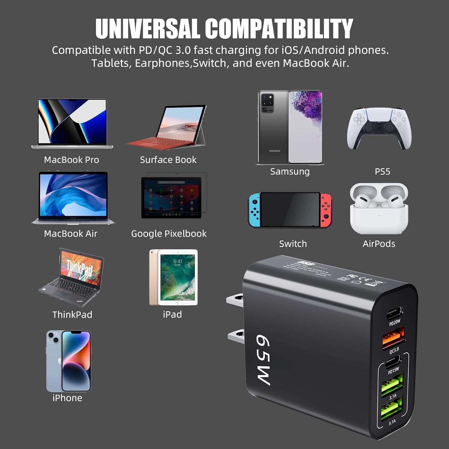 【Compact and Portable】:It takes up no space and is comfortable to carry.All this power comes installed in a pocket-friendly compact body, to go wherever the journey takes you. Ideal for home, office and on the go. We provide this 65W 5-Port USB C Wall Charger (cable not included) with 24 Months Worry-free Replacement and 24/7 Online Customer Service. If you have any problem, please contact us freely.